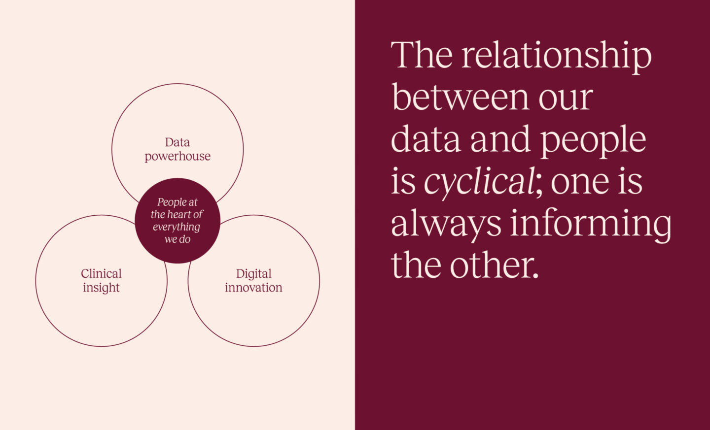 The logo mark’s cyclical form is composed of two identical elements, symbolising the equal importance and mutual influence between the people MHI serve and the data they collect.