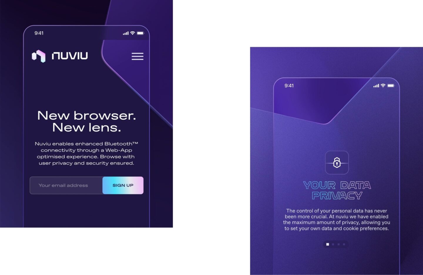 Our efforts included designing a unique headline typeface, drawing inspiration from our distinctive "portal" symbol. We also developed a robust iconography system and a distinct color palette to set Nuviu browser apart from competitors. The strategic choice of owning the purple spectrum on the color wheel ensures a standout visual identity, distinguishing Nuviu from industry norms.